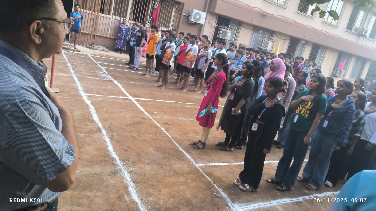 On this occasion, students, teaching staff, and non-teaching staff gathered at the college ground. The programme began with an introduction explaining the significance of the Indian Constitution and the valuable contribution of Dr. B. R. Ambedkar as the chief architect of the Constitution.